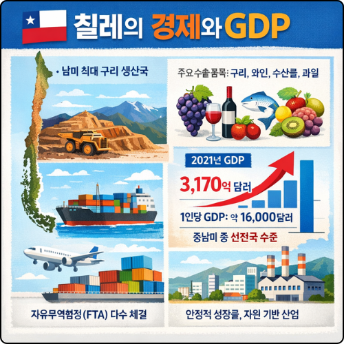 칠레는 라틴아메리카에서 가장 개방적이고 안정적인 시장 경제 체제를 보유한 국가 중 하나입니다. 최근 글로벌 구리 가격의 변동과 내부적인 사회적 개혁 요구 속에서도 견고한 성장세를 유지하고 있습니다.