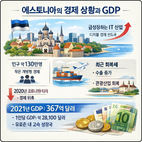 - 구매력 평가(PPP) 기준: 물가 수준을 반영한 1인당 GDP(PPP)는 **40,000달러(USD)**를 상회합니다. 이는 실제 생활 수준이 명목 소득보다 훨씬 높음을 의미하며, 에스토니아인들의 실질적인 구매력이 상당히 강력함을 시사합니다.